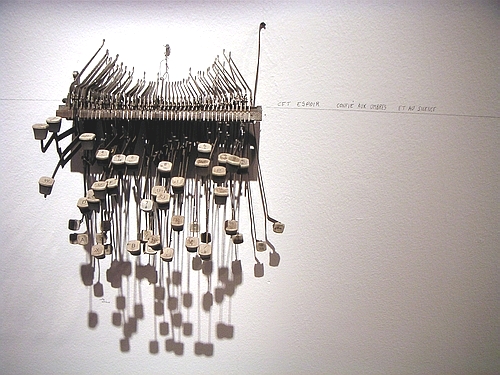 À l’avant de cette table, foisonnante de verres aux couleurs de sable blond, un téléviseur posé à même le sol. Des images répétitives d’un mini-scénario monté en boucle. À première vue, simple redondance de la table et de ses rangs serrés de verres justaposés. Pourquoi reproduire par une image fixe ce que le spectateur a devant les yeux ? C’est que, à y regarder de plus près, cette image n’est pas vraiment fixe : un lâcher de pâtes, surgi du haut de l’écran, emplit de manière discontinue et apparemment aléatoire tel verre ou tel autre. Selon des rythmes séquentiels dont il est difficile de déterminer la fréquence. Il pleut des lettres. Minuscules. Un rideau de lettres. Des mots s’inscrivent en flash sur l’écran. La redondance qu'on imaginait au premier abord s’efface. Elle donne la tonalité dominante de l’exposition. Et quelques clés pour s’imprégner du cheminement complexe de l’artiste. Réflexion sur la lettre. Réflexion sur le rapport qu’elle entretient avec les mots et les objets. Travail sur les mots - mais aussi sur les chiffres - et leur mise en espace. Travail sur la page, travail sur le livre et sur l’écriture. Soit manuscrite, soit typographique.