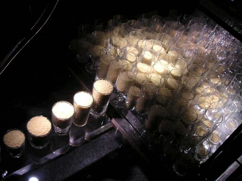 Vaste et lumineux, résolument moderne, cet espace contribue à une mise en relief et en contraste des œuvres de l’artiste. Divisée en trois séquences spatio-temporelles, l’exposition s’ouvre sur un étrange ready-made. Qui happe et intrigue le regard du spectateur. Convié à faire halte et à s’interroger. Sur une table basse en verre sont agencés, dans un ordre crescendo, des verres de tailles multiples. Remplis de pâtes. Des pâtes oui, mais pas n’importe quelles pâtes ! Des pâtes-lettres, qui avaient jadis l’art et l’heur de transformer le potage du soir en exercice ludique. Un art de la fugue et de la variation sur les proportions.