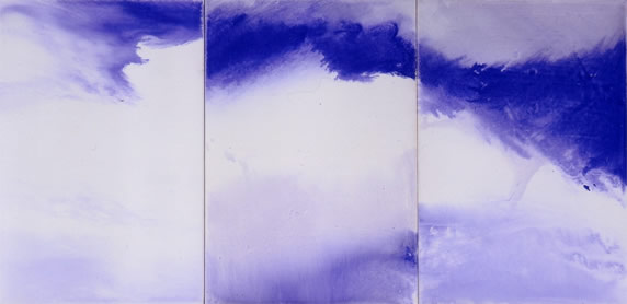 Avec Figures de l’air, Figures de l’eau, nous empruntons d’autres voies ou sillages. Devant nos yeux assoiffés, la couleur encore se fluidifie, l’espace s’allège, le temps appelle ensemble l’aquatique, le végétal ou l’aérien, pas de frontières dans l’effleurement ni la continuité. Un paysage, cosa mentale, coule devant nos yeux en grandes vagues de blanc et bleu, en touches de brun, jaune ou vert, en signes noirs : Naples, Pompéi, Ischia. Beaucoup de vide, souffles et mouvement, peut-être l’Ouvert ? Et pas de preuves, seulement les traces qui font rêver. Des ailes battent ocre ou violet dans le bleu sombre. L’étreinte se perd dans l’outre mer ou l’autre monde. Bleu mouillé, lumière vacante, ombre impalpable, la vision porte là-bas, si loin. Les mots s’éprennent.