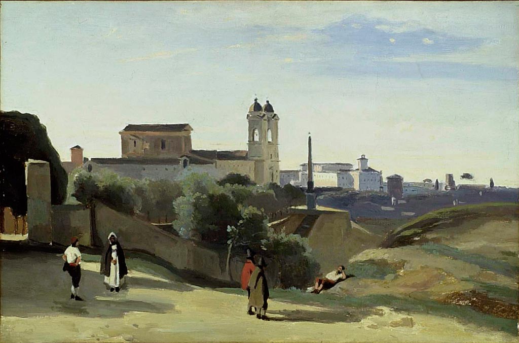 | En 1843, Corot revient une dernière fois à Rome. Il exécute notamment Tivoli, les jardins de la villa d’Este (huile sur toile, 43 x 60 cm, Musée du Louvre, 1843). « Un modèle d’équilibre dans la composition et d’harmonie chromatique ». Et Monte Pincio (huile sur toile, 27 x 40,6 cm, The Art Institute of Chicago).De ses pérégrinations en France, de sa fréquentation de l’école de Barbizon et de ses séjours en Île-de-France, le peintre a retenu les ciels mouvants, les modulations de la lumière, les couleurs nacrées qui imprègnent feuillages et étendues d’eau. De ses voyages en Italie, l’harmonie naturelle des formes, leur bel ordonnancement, l’éclat de la lumière méditerranéenne. Une lumière génératrice de vie. Les œuvres de Corot sont marquées par l’une et l’autre empreinte. De cette osmose parfaite entre le nord et le sud est né le génie de Camille Corot. Un grand maître. |