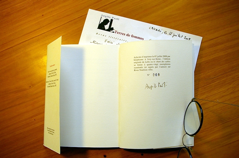 J'ai reçu et lu lentement le très beau livre d'Angèle Paoli Lalla ou le chant des sables, édité par Terres de femmes. J'ai envie de partager ma joie avec vous tous.